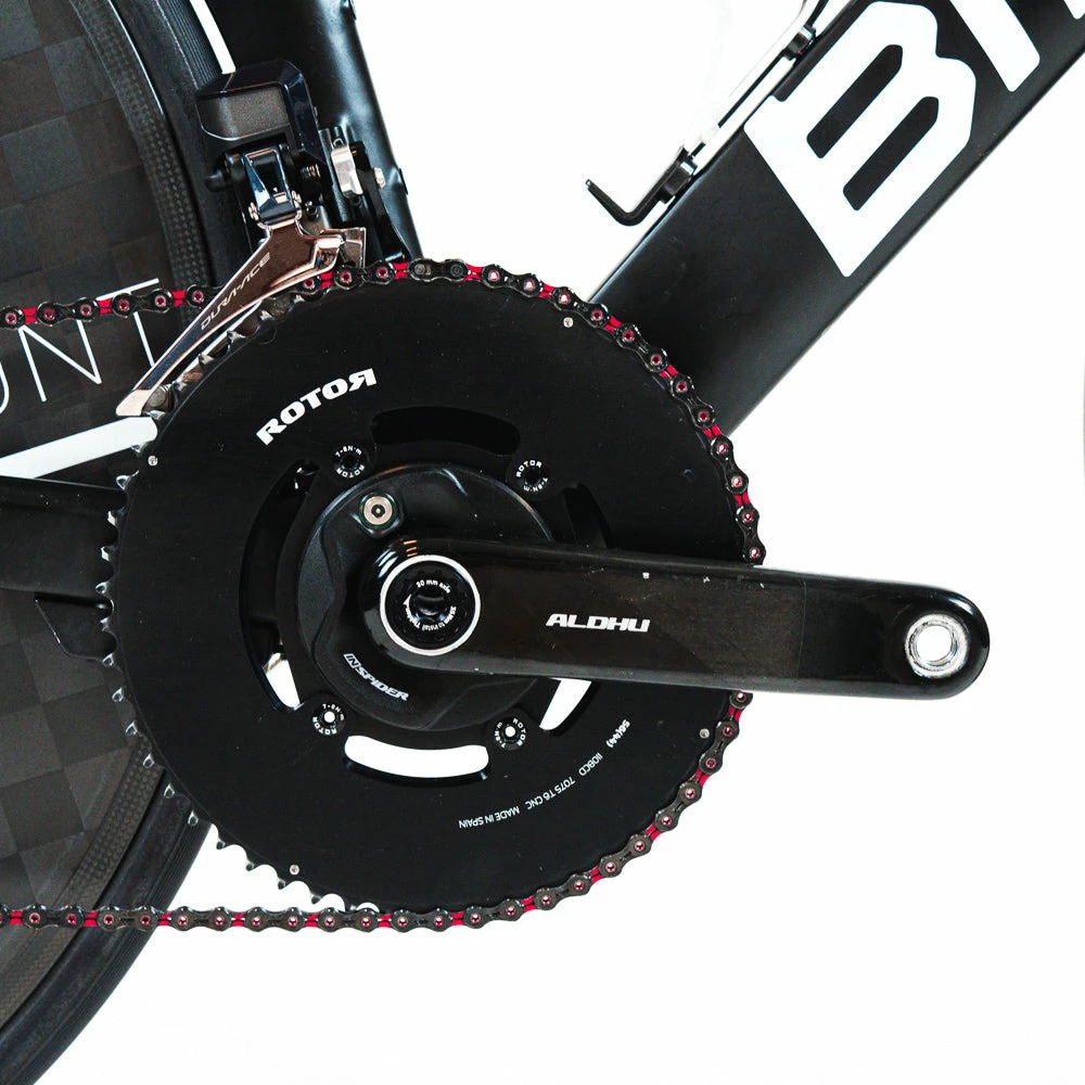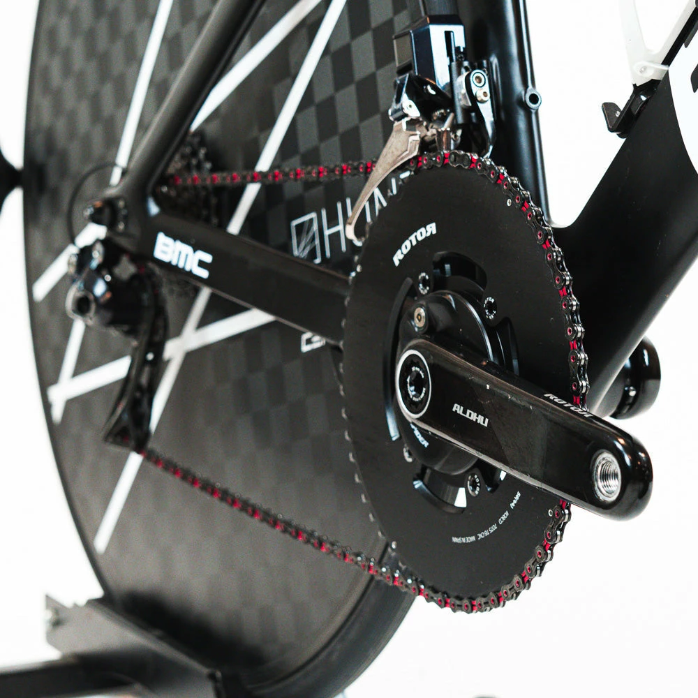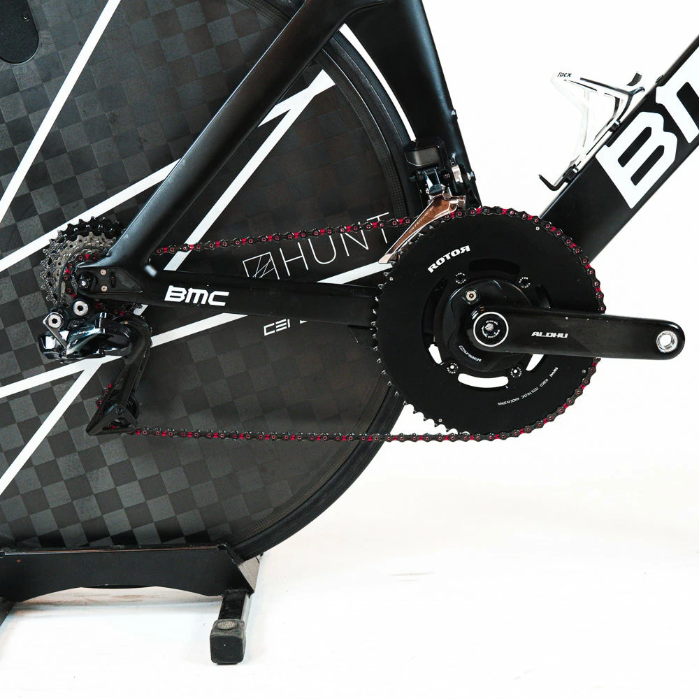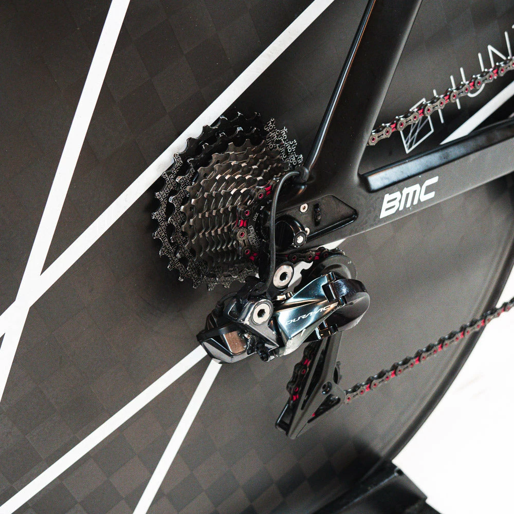 The Frameset has been used but is in Very good condition. The frameset is built with a Shimano Dura-Ace Di2 groupset, a Rotor power meter carbon crankset, team-specific BMC components and a Hunt Aero TT-specific wheelset.