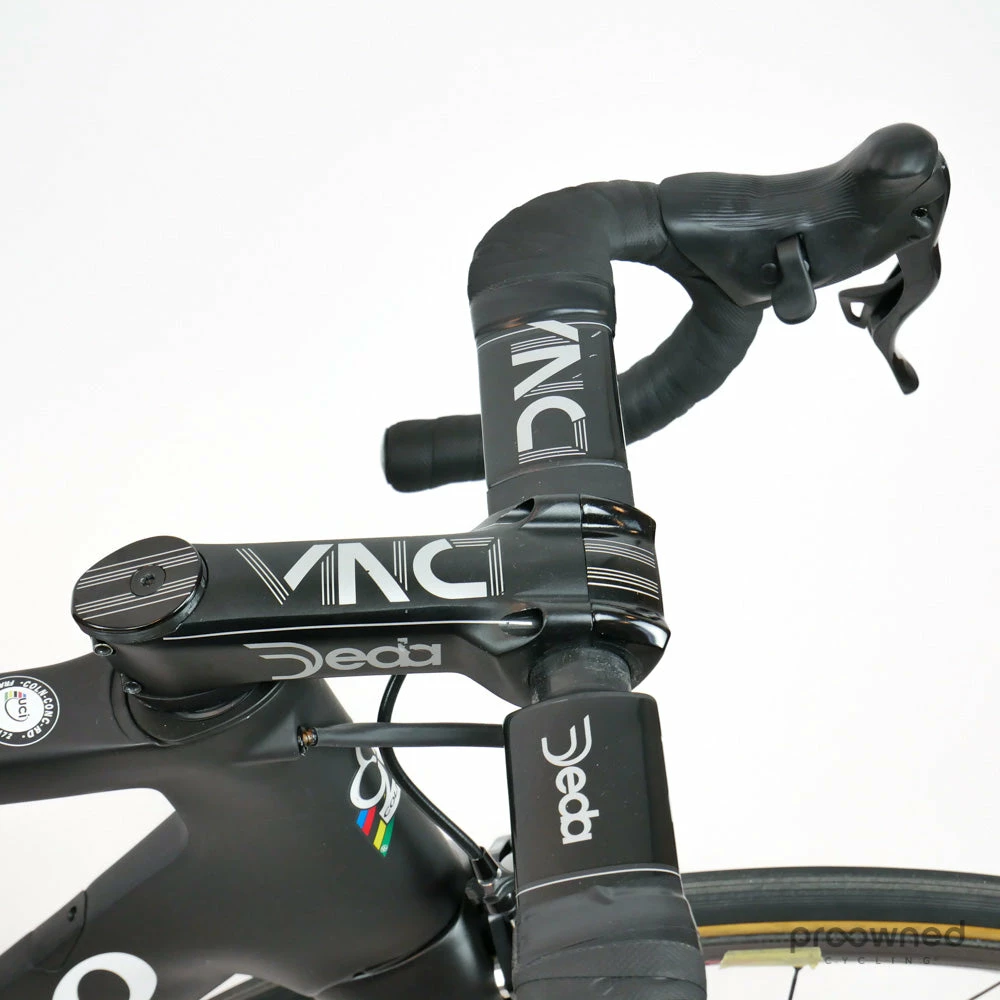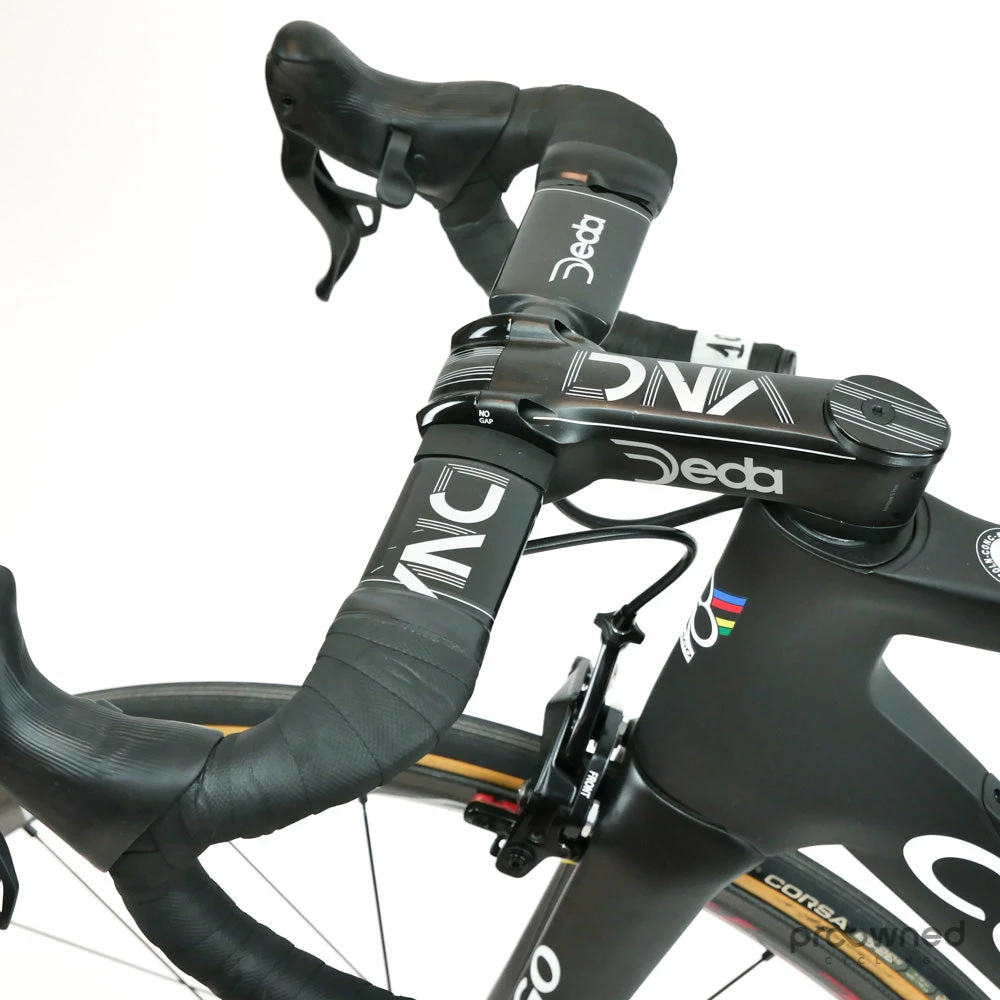 The Colnago Concept has been fitted with a strong, stiff, and lightweight cockpit by the team mechanics, featuring an alloy stem and carbon handlebar.