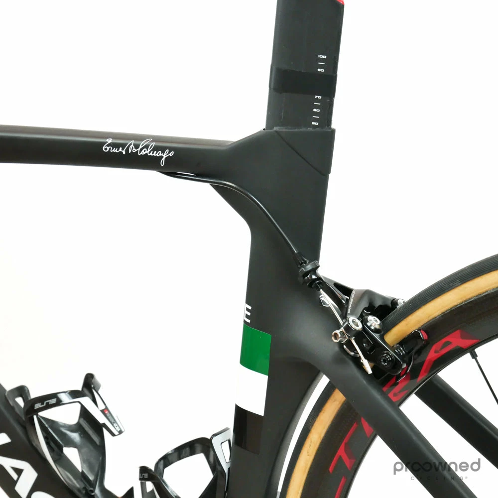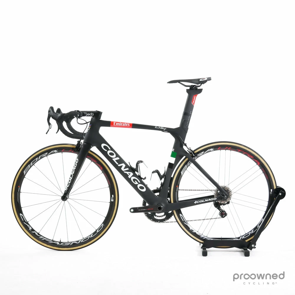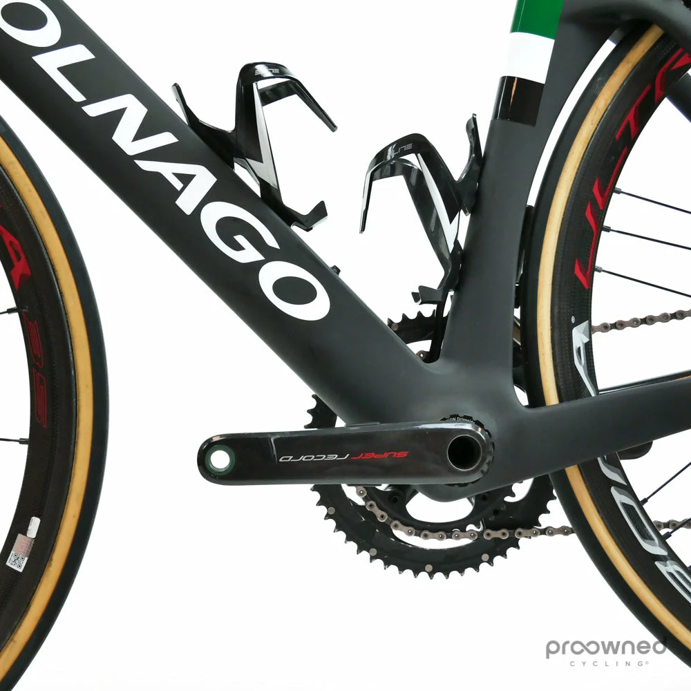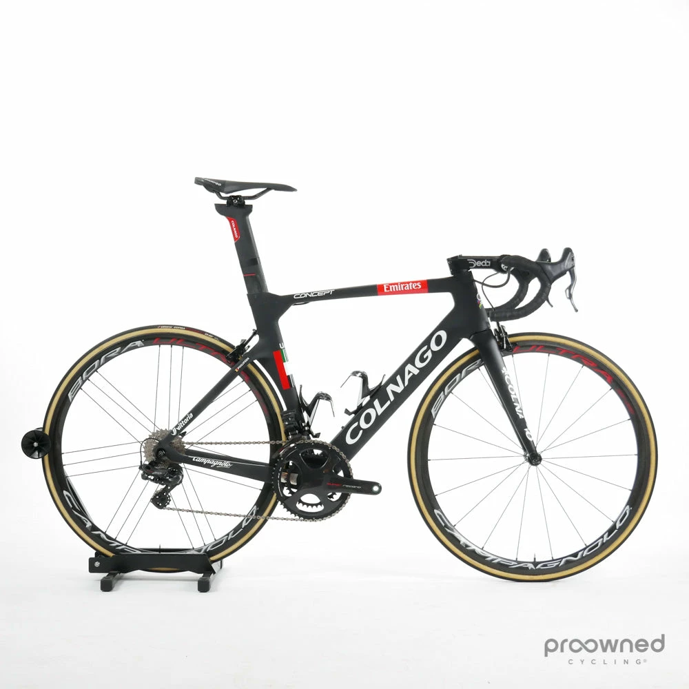 Colnago Concept carbon road bike with rim brakes and Campagnolo Super Record EPS 12-speed groupset featuring Campagnolo Bora Ultra 35 carbon wheelset. The bike was designed for UCI World Tour team UAE Emirates.