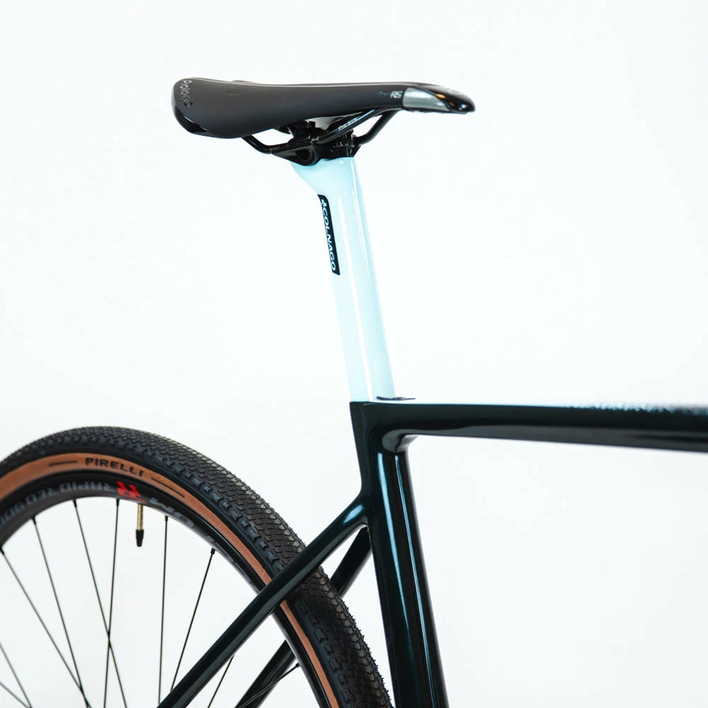 The gravel and long-distance geometry feature a longer chainstay, lower bottom bracket and a longer top tube. The geometry provides a forward-leaning rider position and a compact, lower centred, rider position. This results in great off-road control and balance.