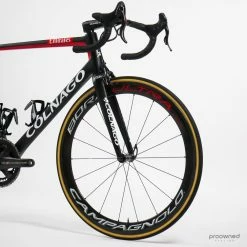Colnago V3Rs carbon road bike with rim brakes and Campagnolo Super Record EPS 12-speed groupset featuring Campagnolo Bora Ultra 50 carbon wheelset. The bike was designed for UCI World Tour team UAE Emirates.