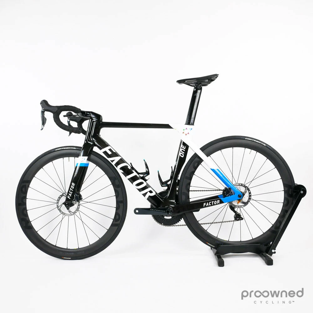 The bike will be partly disassembled when shipped. The bike is sold without a Di2 charger. The Factor One is only compatible with electronic shifting groupsets. The bike can use 160mm front discs with the included adapter.