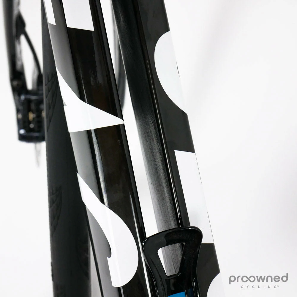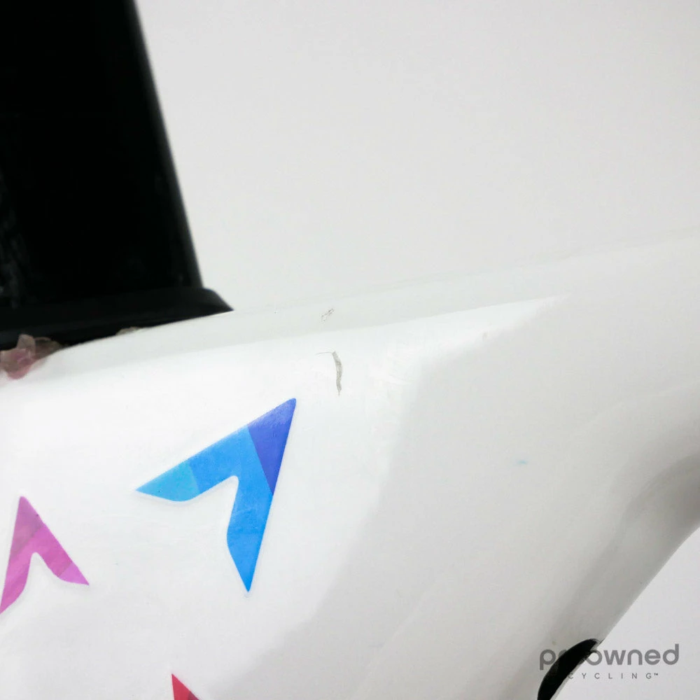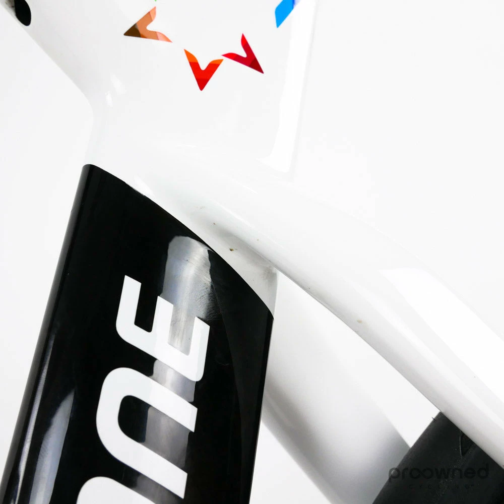 The geometry ensures an aggressive and fast position on the bike while also maintaining an incredible comfort, necessary to perform on long stages of the World Tour. Featuring ample knee clearance during sprinting, an ergonomic integrated handlebar, and a 1-bolt saddle clamp aero seatpost. This is a high-tech disc frame with extraordinary performance.