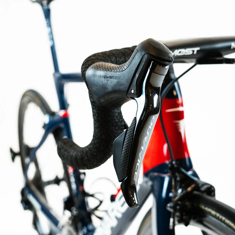 The condition of the bike frame is Very good, and the components varies from Brand new to Very good – please see the details below. The bike is built with a Shimano Dura-Ace Di2 groupset, team-specific components, and a Shimano Dura-Ace C40 R9100 wheelset.