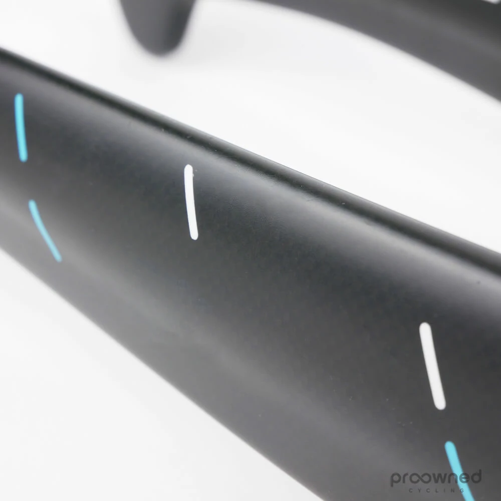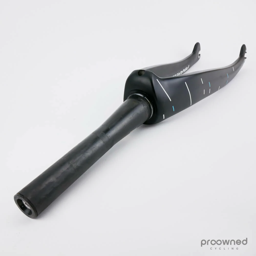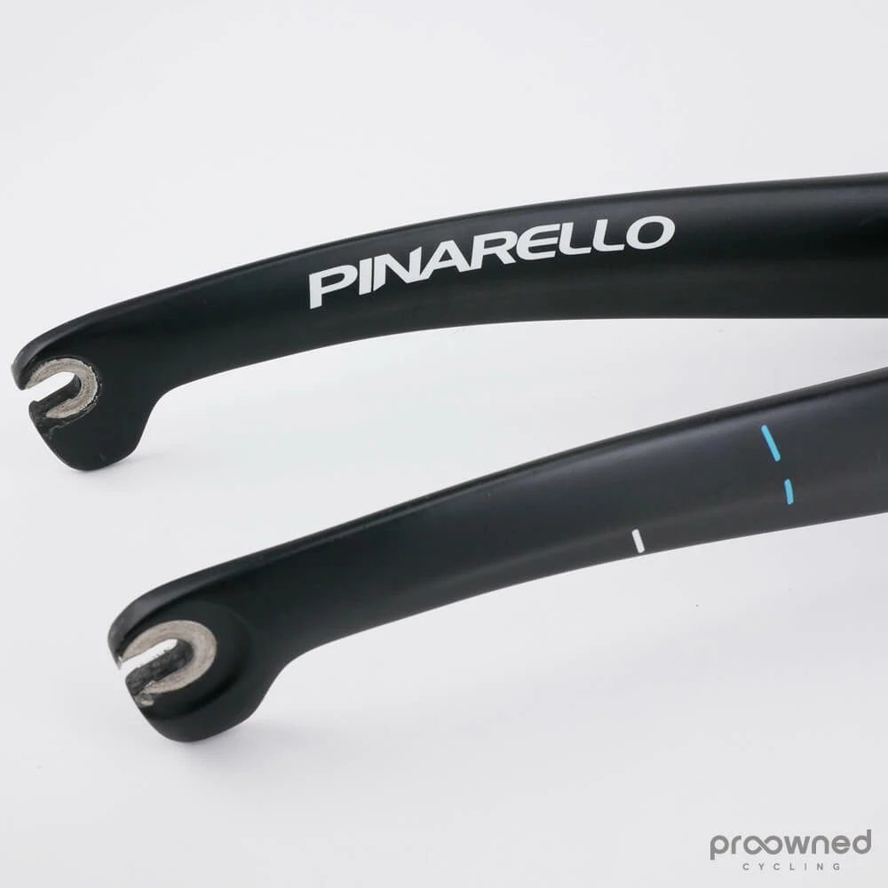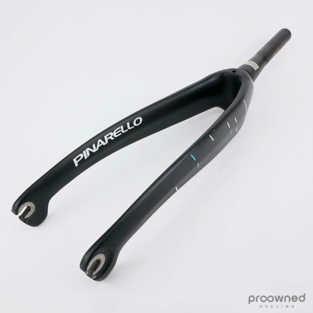 Pinarello Dogma F8 fork. The fork fits the Pinarello Dogma F10/F10 X-Light/F8/K8/K8-S bikes and this has a special Team Sky color scheme. The fork is cut to a length of 20,5cm. It has some minor scratches on the inside of the fork and the fork legs. It is in good condition.