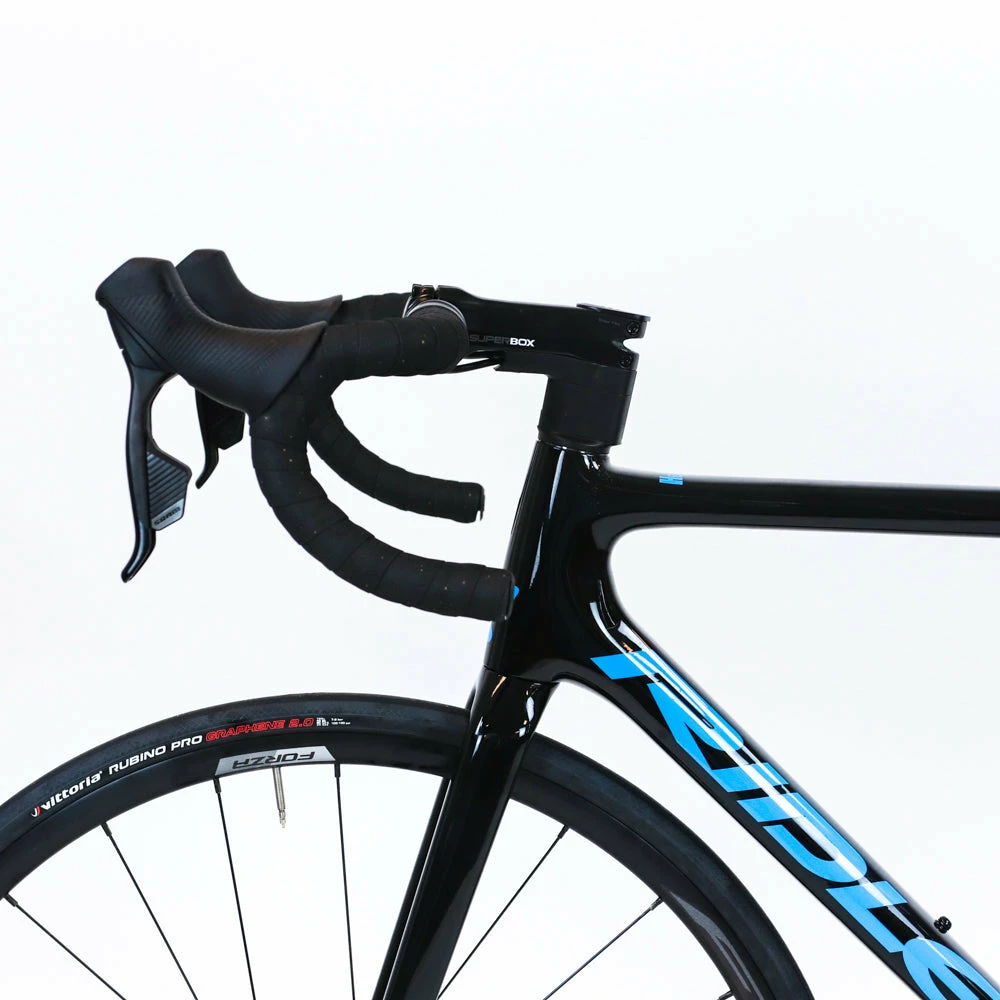 The bike is built with SRAM Rival eTap AXS 12-speed electronic wireless groupset, Deda and frame specific components, and a Forza Norte alloy clincher wheelset.