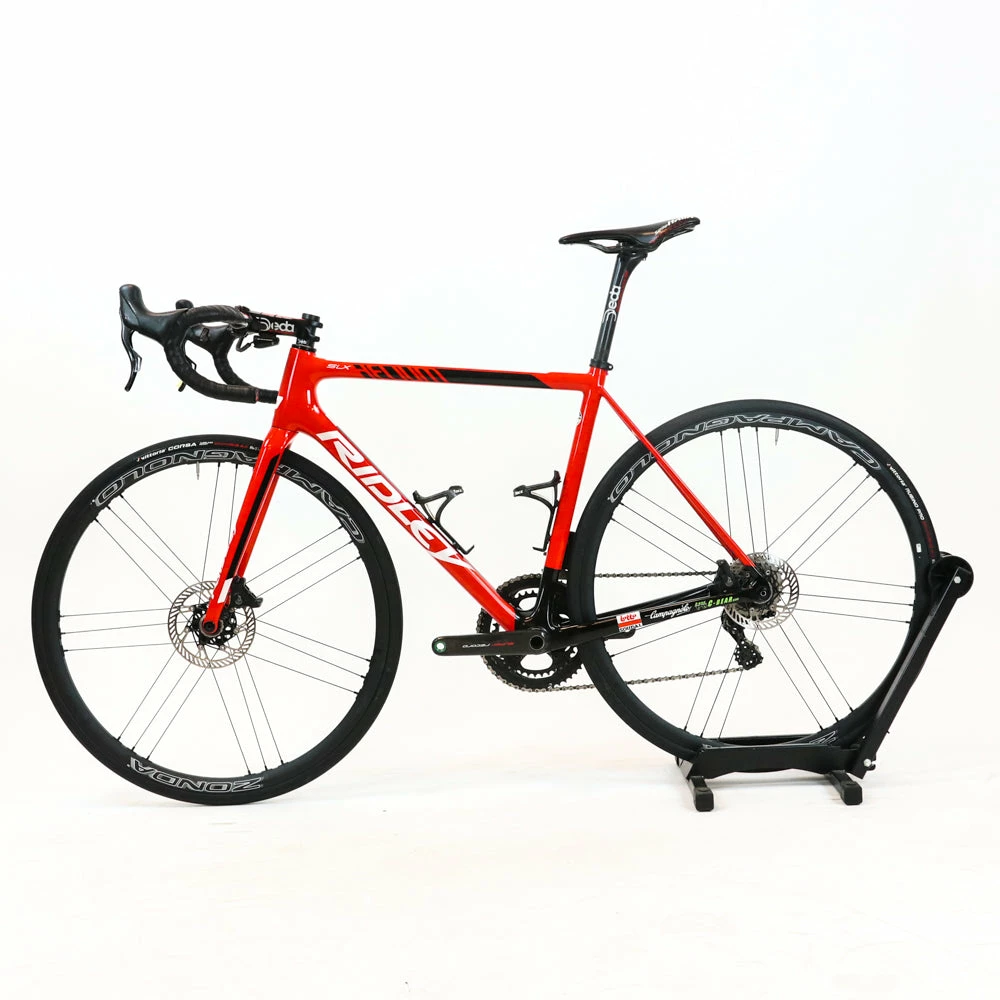 Ridley Helium SLX carbon road bike with disc brakes and Campagnolo Super Record EPS 12-speed groupset featuring a Campagnolo Zonda disc carbon wheelset.