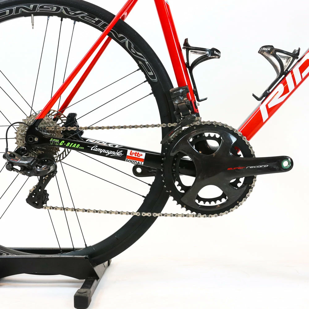 The bike is built with Campagnolo Super Record electronic EPS 12-speed groupset, team-specific carbon components, and a Campagnolo Zonda Disc clincher wheelset.