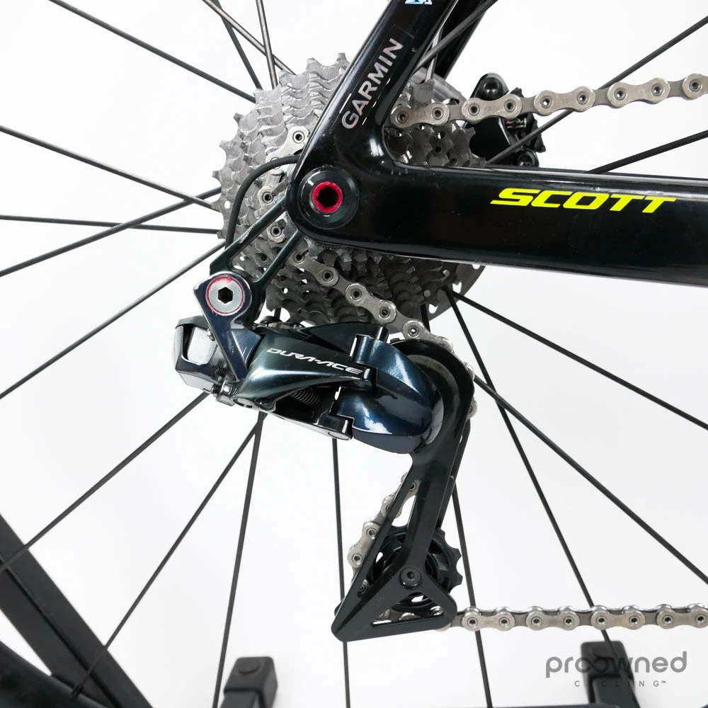 The team mechanics have well maintained this bike, and our Mechanic has furthermore restored it. It is equipped with the top-of-the-line electronic Dura-Ace 9170 2×11 speed Disc groupset by Shimano.